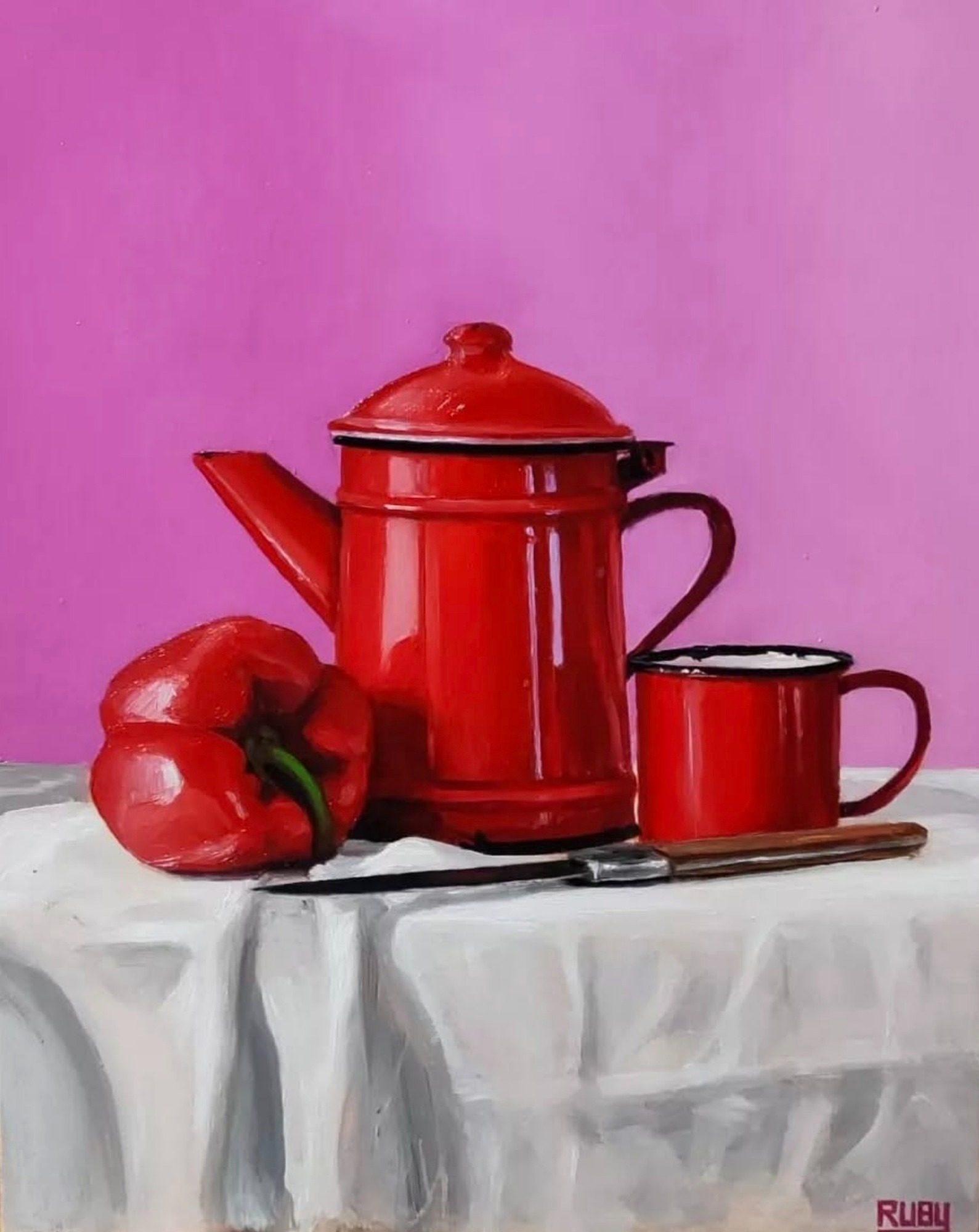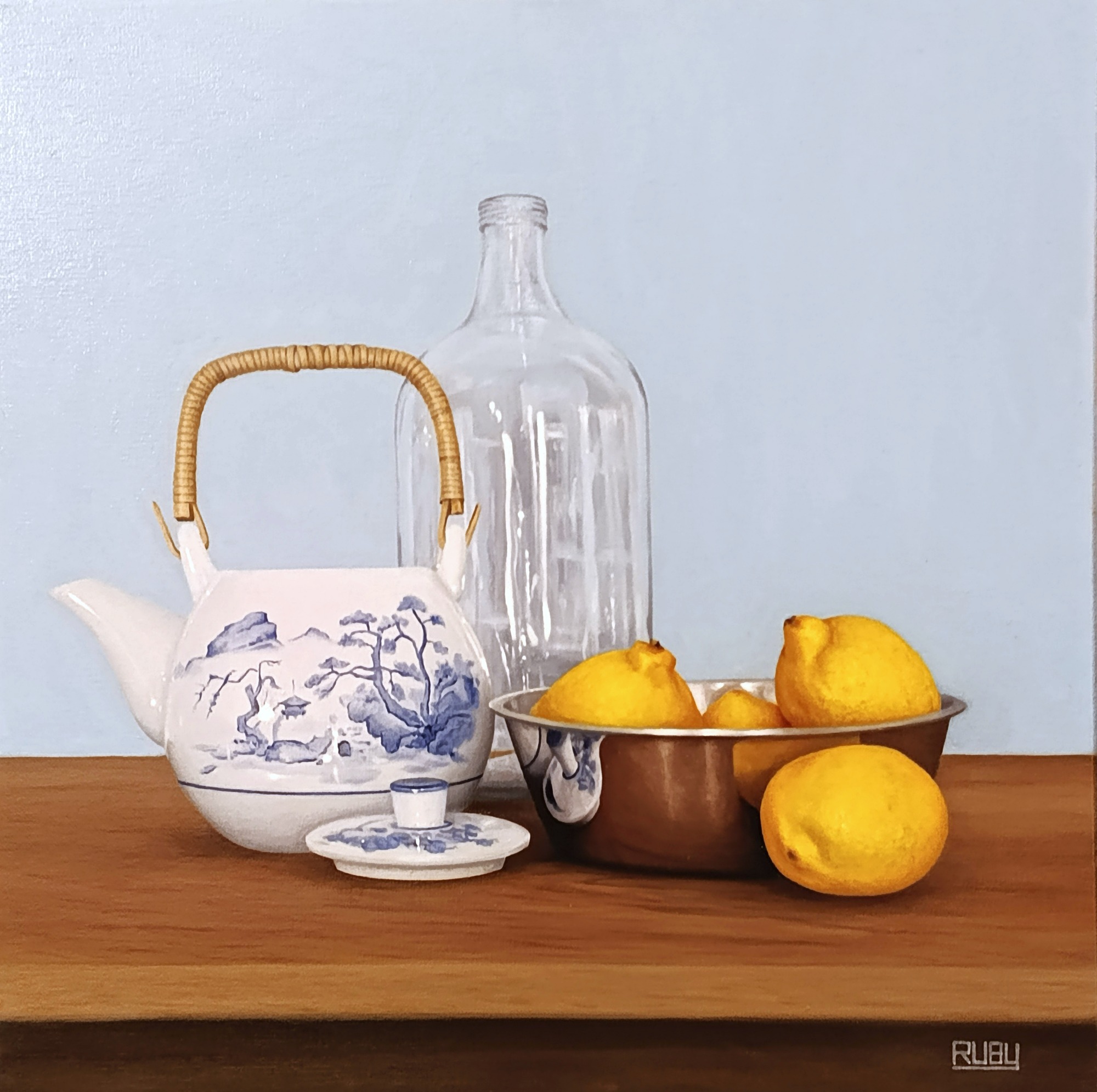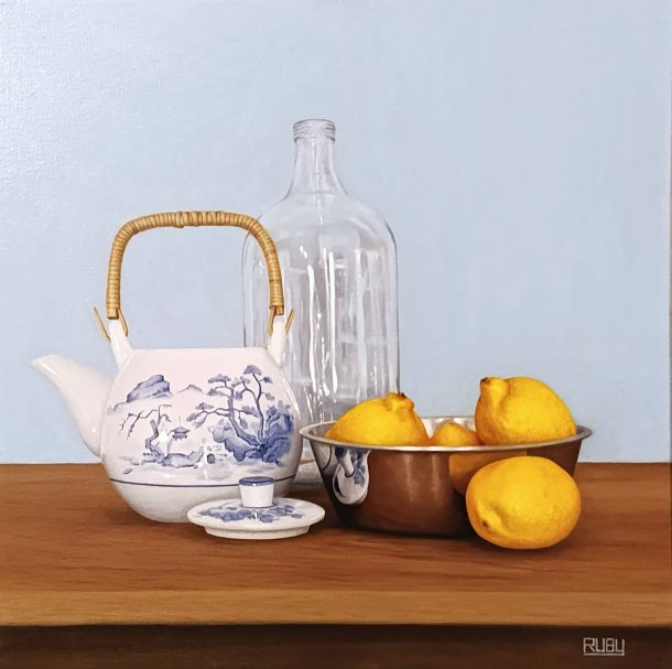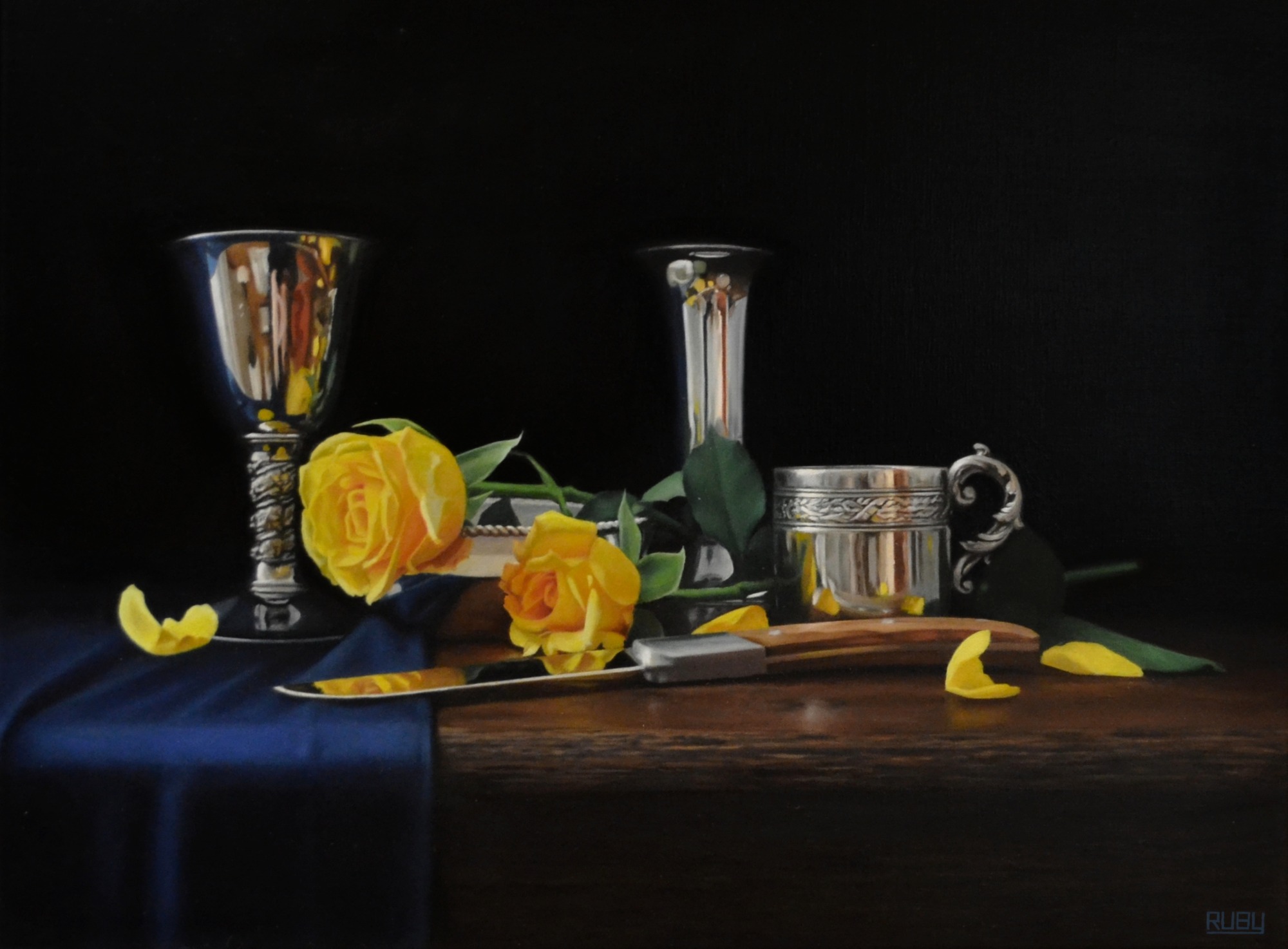 Still life oil paintings of classical and contemporary objects, painted on fine Belgian linen with glossy varnish. All still lifes come mounted in a frame selected by the artist. Characteristic use of bright and vibrant colors with pronounced or neutral light in realistic or alla prima style.
